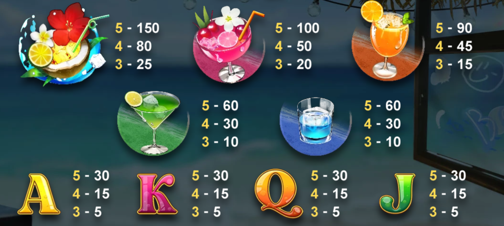 橙汁、藍色調酒和青檸馬天尼則為中價值符號,最高可賠付90倍。這些符號設計精緻,彷彿能感受到它們冰涼的口感。我認為,這些圖案不僅帶來了高額的賠付機會,還完美契合了遊戲的夏日酒吧主題。