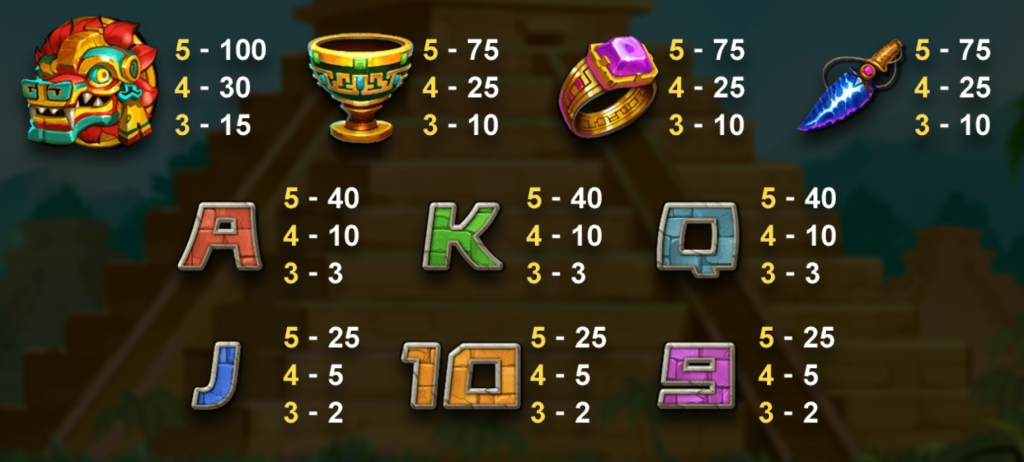 金色的杯子、鑲嵌寶石的戒指以及閃耀著神秘光芒的匕首,分別代表著高額獎勵的中等符號。當玩家湊齊5個這些符號時,可以贏得75倍的賠付,而4個與3個的回報則為25倍和10倍。這些符號不僅象徵著古代瑪雅文明的財富與力量,還讓玩家在冒險過程中倍感刺激。