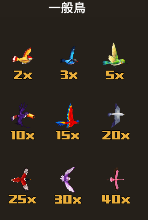 遊戲中的「一般鳥」賠付範圍從2倍至40倍不等。像是2倍的黃色鳥與3倍的藍色鳥,是玩家最常捕獲的目標,適合作為穩定的基本回報。而像20倍的白鷗和40倍的粉色鳥,則是稀有且回報豐厚的目標。我覺得,這樣的設計非常平衡,既能讓玩家持續感受到小額回報的樂趣,又能期待捕獲高倍鳥類的刺激。