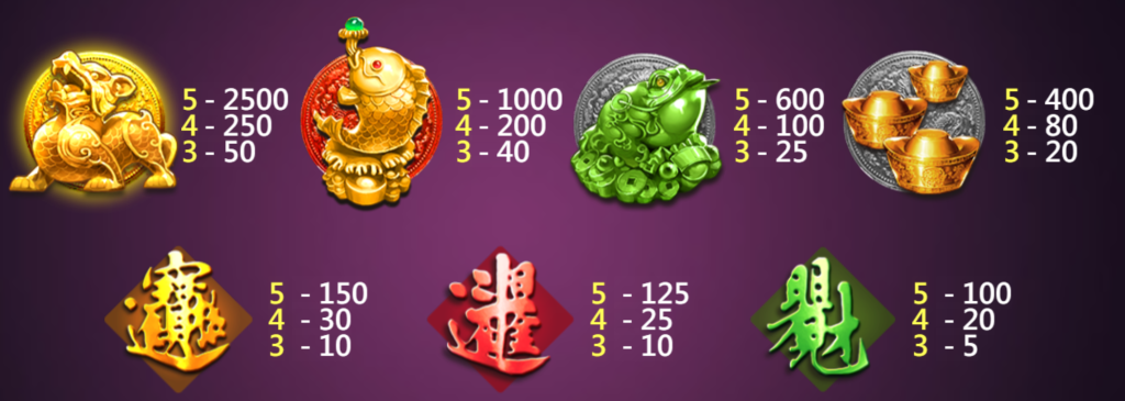 高價圖案如金龍與金魚占據了遊戲的核心位置。金龍是最具價值的符號,五個金龍圖案可賠付高達2500,象徵財富與力量,讓玩家感受到大獎的誘惑力。而金魚則緊隨其後,五個金魚的賠付為1000,雖然略低,但依然是高額獎勵之一。我覺得這兩個符號的設計不僅僅是數字的吸引力,還帶有強烈的寓意,金龍代表守護財富,金魚則象徵年年有餘,玩家很容易產生情感共鳴。