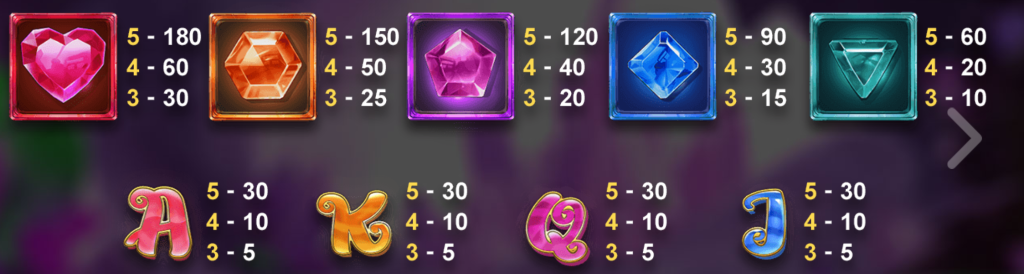 中等賠付的符號包括藍色鑽石與綠色三角形寶石,分別提供最高90倍與60倍的賠付。我認為,這些符號的存在有效平衡了遊戲的獎金結構,為玩家提供了穩定的中等收益,讓每次旋轉都充滿期待。