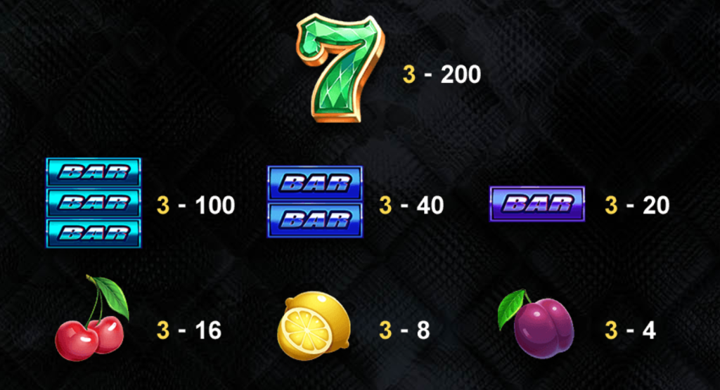 接著,傳統的BAR符號分為三層BAR、雙層BAR和單層BAR,分別對應不同的賠付。當玩家轉出3個三層BAR時,可以獲得100倍獎勵,而雙層BAR則帶來40倍回報,單層BAR則可獲得20倍。這些熟悉的符號讓人想起經典的街機老虎機,增添了懷舊的氛圍,但在賠付上仍具有不錯的回報。