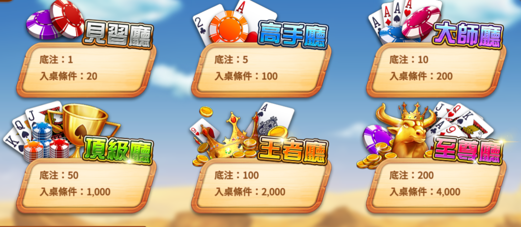 為了滿足不同玩家的需求,金牛王-搶莊提供了六種不同等級的場館,每個場館都有不同的底注與入桌條件,從新手到高手,人人都能找到適合自己的戰場。