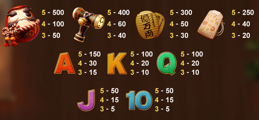 達摩不倒翁象徵堅韌與幸運,在遊戲中也是最具價值的符號。當玩家轉出5個時,將獲得高達500倍的回報,而4個或3個分別有100倍與50倍的獎勵。我認為,這個符號的出現不僅帶來高額獎金,也象徵著好運的降臨。