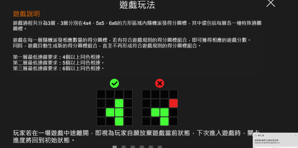 • 第一層:4×4 遊戲區域,最低連線條件為4個以上相同圖案。