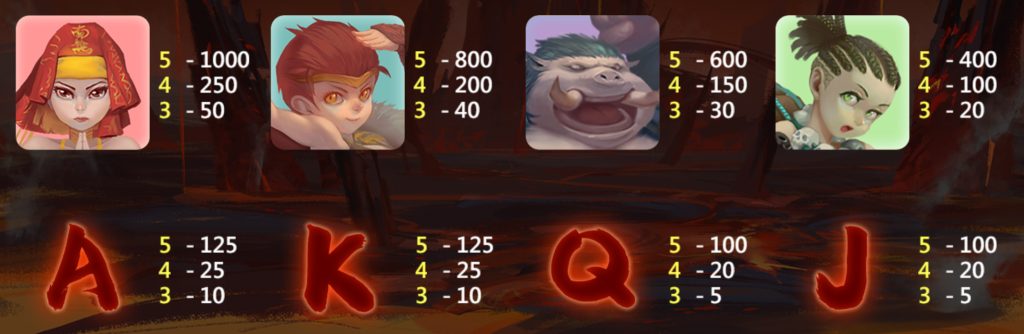 最具價值的圖案無疑是身穿紅色頭巾的角色(唐僧)。我認為這個符號代表著遊戲中的高價值獎勵,當玩家在轉軸上獲得5個唐僧圖標時,即可獲得高達1000倍的賠付,而4個則有250倍,3個也能帶來50倍的獎勵。