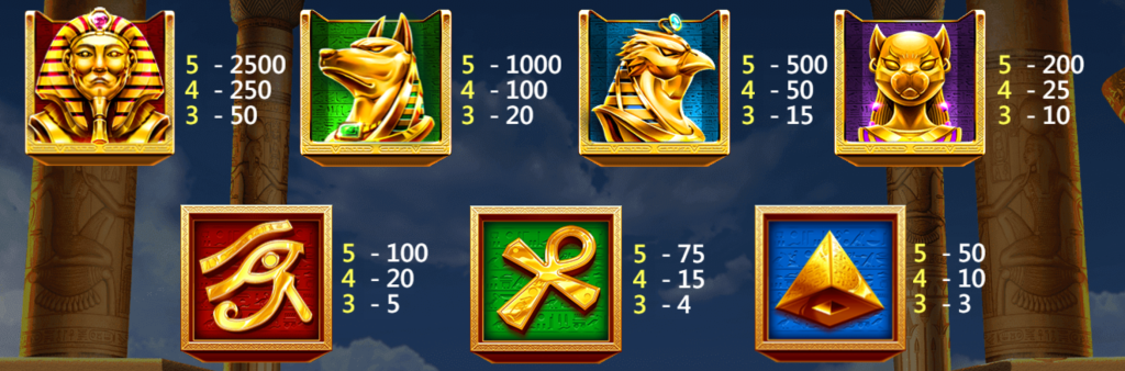 生命之鑰作為埃及文化的標誌,在本遊戲中也擁有不錯的賠付,5個可帶來75倍,4個15倍,3個4倍的回報,我認為這類符號是玩家在等待高額符號時的最佳補充。