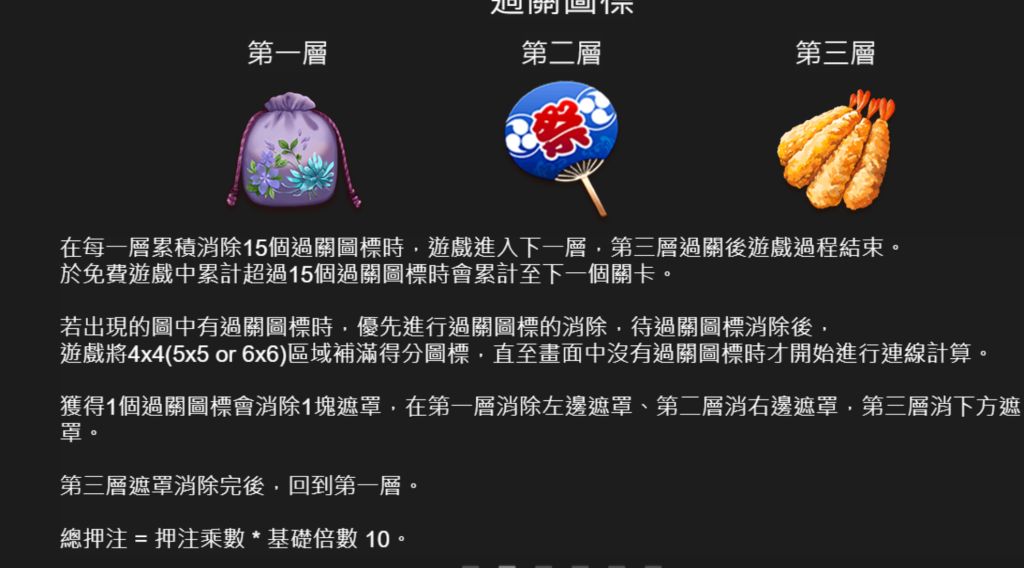 當畫面上出現過關圖標時,系統將優先進行過關圖標的消除,然後補充新的符號,遊戲會自動進行補滿動作,範圍為4×4、5×5或6×6,直到畫面中不再有過關圖標為止,接著才會進行其他壽司符號的連線計算。