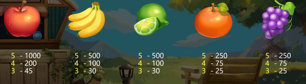 本遊戲採用標準的五軸三排設計,玩家可透過轉軸組合獲取各種獎勵,包含高分字母「A、K、J、10」,以及特殊符號如「WILD(百搭)」和「FREE SPINS(免費遊戲)」,為玩家帶來額外驚喜。此外,遊戲還提供蘋果、香蕉、檸檬等經典水果圖案,與主題相呼應,增添樂趣。