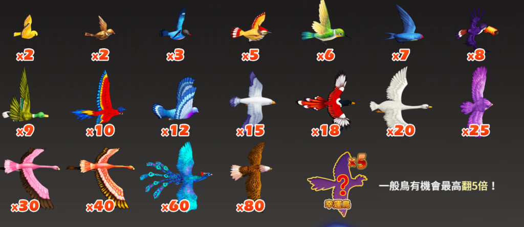這款遊戲最特別的地方,就是加入了幸運鳥(x5)機制!這意味著,當玩家捕捉到某些普通鳥類時,有機會觸發額外加成,讓原本的賠率最高翻5倍!想像一下,如果你原本擊中的鳥是x20,那麼透過幸運機制,它的獎勵有可能瞬間變成x100,這種爆發性賠付絕對是讓人心跳加速的關鍵時刻!
