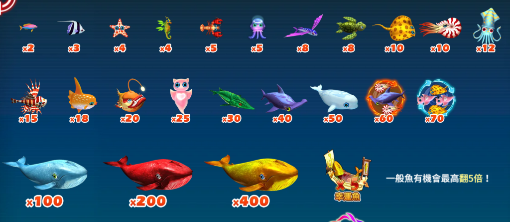 除了基本的賠付機制,遊戲還設有幸運魚(x5)機制,這代表部分普通魚種有機會觸發5倍賠率加成。換句話說,原本倍率較低的魚種,可能在瞬間變成高額獎勵!我覺得這種隨機翻倍機制非常有趣,因為它讓遊戲充滿變數,哪怕是小魚,也可能帶來驚人的回報。