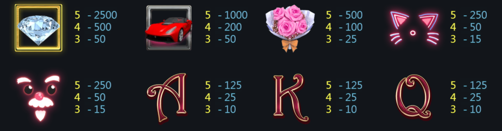 《直播女神》的賠付機制十分合理,從高額賠付的鑽石與跑車,到中等獎勵的玫瑰與霓虹符號,再到基本的字母符號,構成了一個層次分明的獎勵系統。我認為這樣的設計讓遊戲兼具了娛樂性與回報率,使得玩家無論是追求極致大獎,還是希望穩定獲利,都能夠找到適合自己的玩法。