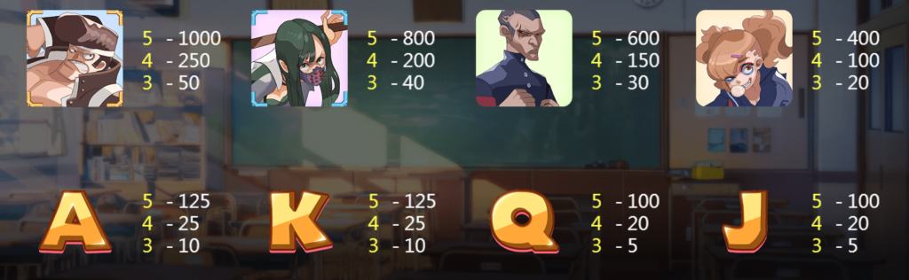 遊戲中的高價值符號,代表著學院內最強的格鬥家。像是最頂級的霸氣鬥士,他的賠付高達1000倍,成為玩家們爭奪的關鍵圖標。緊接著是蒙面女戰士,她以神秘的風格與強大的實力提供800倍的回報。學院內的頭號惡霸與冷血教官則分別帶來600倍與400倍的獎勵,這些角色的設計使得遊戲不僅僅是轉動輪盤,更像是一場學院內的格鬥大賽,每個角色的價值都代表著他們的戰鬥能力。