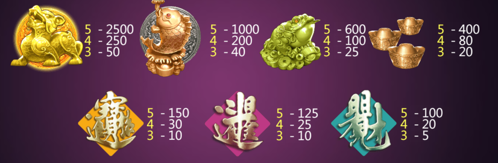 遊戲的高價值圖標包含貔貅、金魚、金蟾蜍與金元寶等,這些都是東方文化中代表財富與福運的象徵。其中,貔貅作為最具代表性的財運圖標,擁有最高賠付,當玩家成功獲得五個貔貅圖標時,可觸發最高的獎勵。而金蟾蜍則是傳統意義上的招財瑞獸,象徵著財源滾滾,當其連成一排時,玩家將迎來一場金銀滿堂的財富暴擊。