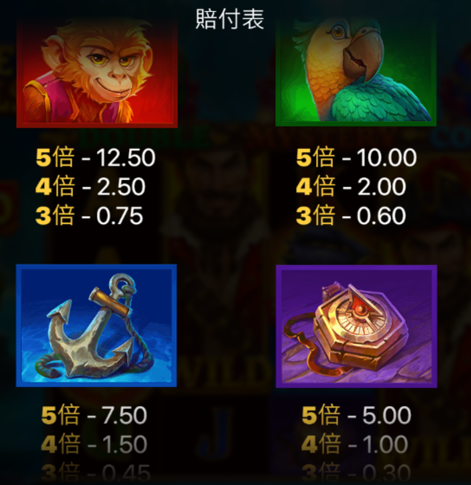 在所有符號中,猴子無疑是最高價值的圖案,當玩家轉出五個猴子符號時,即可獲得12.50倍的賠付。我覺得這樣的設計符合遊戲的海盜主題,因為猴子在許多海盜故事中都是忠誠而機智的夥伴,每當它出現時,就像是在為玩家帶來財富的吉兆。