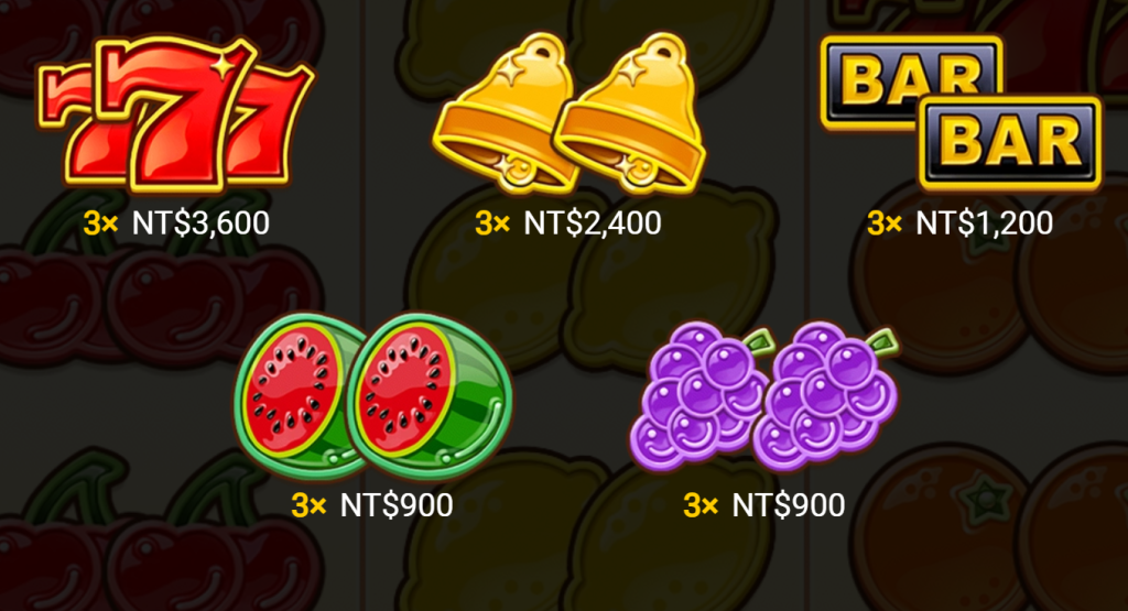 除此之外,雙BAR符號同樣不容忽視,當畫面上出現3個BAR時,可獲得$1200的獎金,這讓遊戲的賠付層次更加豐富。至於水果類圖案,像是西瓜與紫色葡萄,則屬於中等賠付等級,3個相同符號可分別獲得$900,即使是較低賠付級別的符號,仍然能帶來不錯的回報,讓玩家在遊戲過程中享受穩定的中獎體驗。