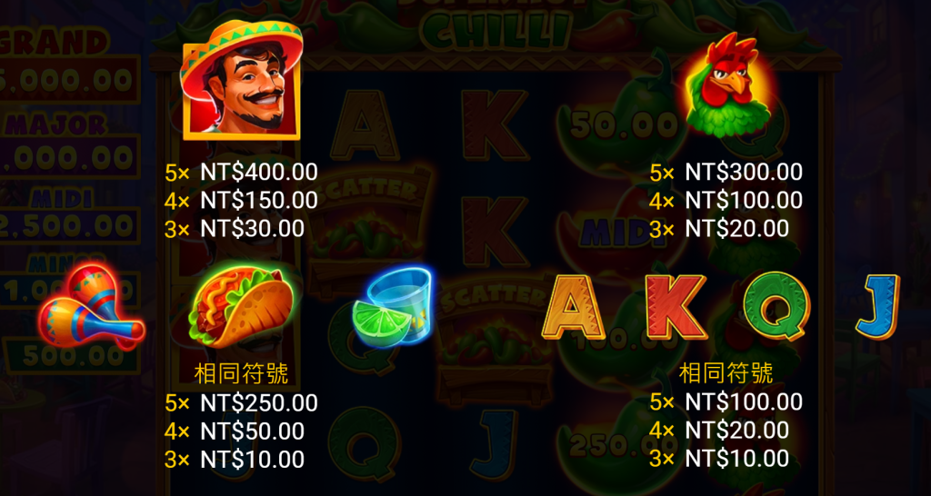 遊戲的核心元素是火辣的紅綠辣椒與炙熱的獎金機制,當玩家轉動轉輪時,金燦燦的辣椒圖標會帶來豐厚的即時獎勵,而五種不同等級的Jackpot獎池更是遊戲的一大亮點,每次旋轉都可能觸發巨額獎勵。此外,三個SCATTER符號能夠開啟免費遊戲模式,讓玩家有機會贏取更多的彩金,體驗持續滾動的熱辣刺激。