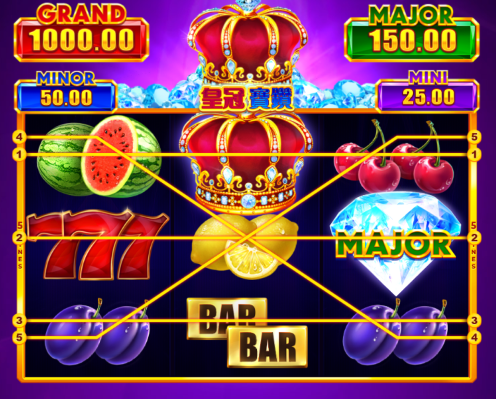 《皇冠寶鑽-集鴻運3×3》是一款將經典水果機元素與奢華寶石、皇冠相結合的電子遊戲,帶來極致尊貴的視覺與獎勵體驗。整體遊戲畫面閃耀金光,紅色皇冠、璀璨鑽石、高額彩金數字映照在紫色皇家背景上,讓每一次旋轉都充滿貴族氣息,彷彿走進一場專屬於王者的財富盛宴。