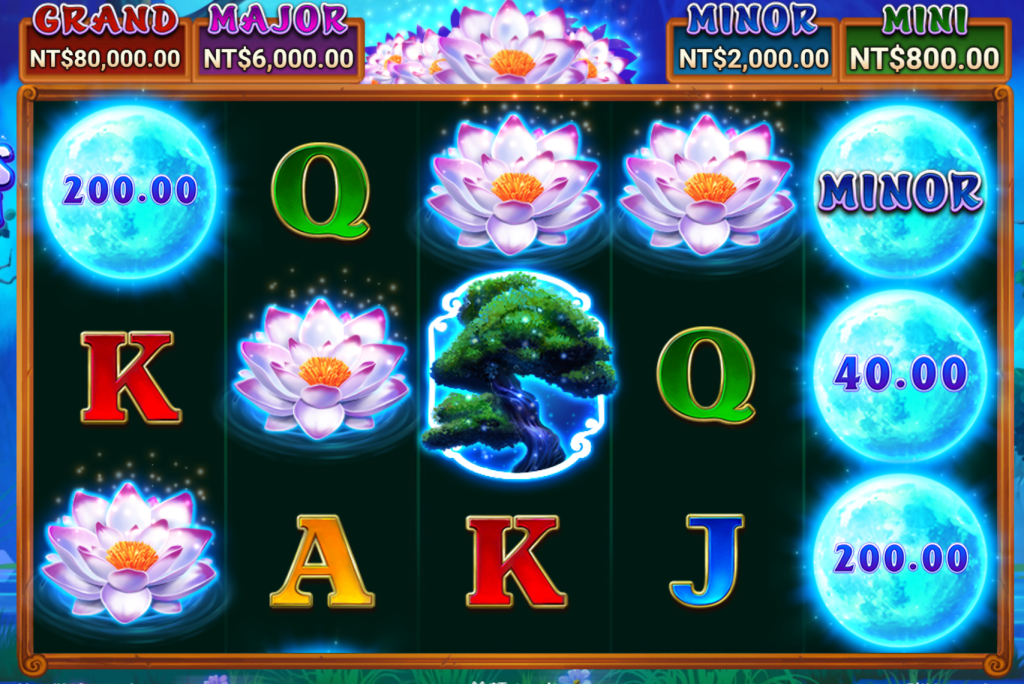 遊戲中設有GRAND、MAJOR、MINOR、MINI四種彩金,讓玩家有機會贏取豐厚獎勵。畫面以夢幻藍色為主調,金光閃耀的月亮符號與神秘的許願樹,象徵著財富與幸運的降臨。蓮花為遊戲的核心圖案,代表純淨與繁榮,搭配K、Q、J、A等經典字母符號,增加遊戲變化性。