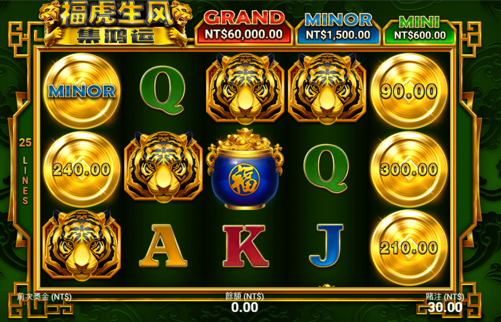 虎頭符號作為高價值圖案,連線後能帶來豐厚回報,福祿寶盆則可能觸發額外獎勵或免費遊戲模式。遊戲介面簡潔流暢,適合新手與資深玩家。投注門檻親民,最低$30即可暢玩,無論是尋求娛樂還是挑戰大獎,《福虎生風-集鴻運》都是理想選擇!