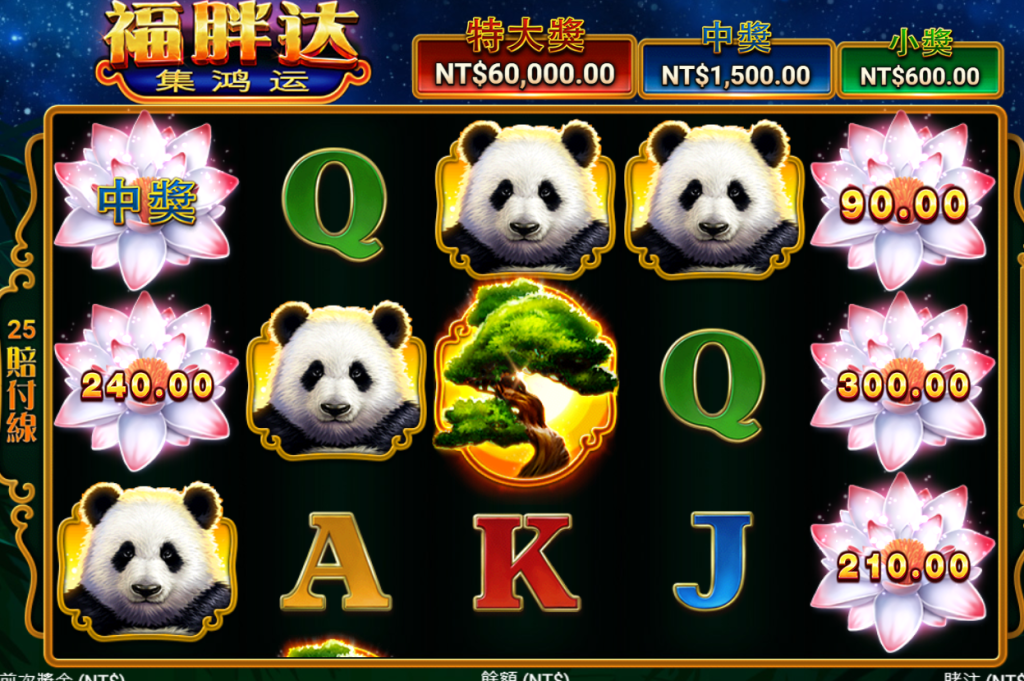 遊戲採用25條支付線設計,畫面以可愛的大熊貓為主角,搭配金光閃耀的蓮花與神秘古樹,營造出獨特的財運氛圍。玩家可透過轉動捲軸,獲取豐厚獎勵,其中蓮花符號代表金幣獎勵,當收集到足夠數量即可觸發小獎、中獎或特大獎!
