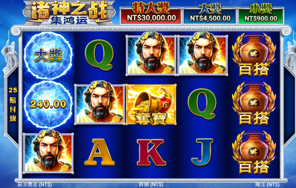 遊戲採用25條支付線設計,搭配華麗的圖像與震撼的特效,讓玩家沉浸於戰神宙斯的壯麗戰場。特殊符號如「奪寶」與「百搭」能觸發不同的獎勵機制,提高中獎機率。遊戲內設有「特大獎」、「大獎」、「小獎」!閃電球獎勵機制讓玩家有機會贏得額外驚喜。