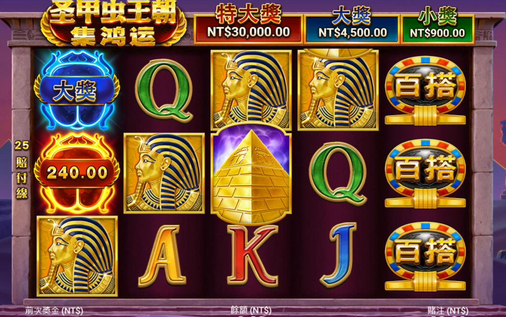 遊戲擁有25條支付線,並結合金字塔、法老、聖甲蟲等象徵吉祥與財富的元素,搭配絢麗特效與沉浸式音效,讓玩家彷彿置身於埃及的黃金時代。遊戲內含「特大獎」、「大獎」、「小獎」!