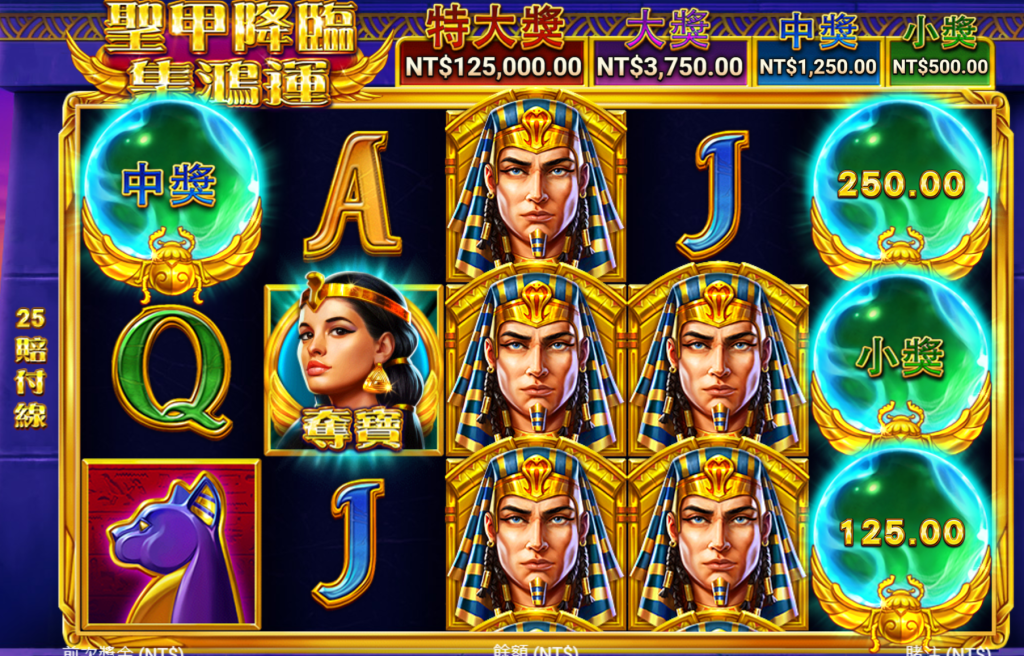 BNG電子-《聖甲降臨-集鴻運》是一款以古埃及神秘文明為背景的高爆發電子遊戲,帶領玩家踏入法老的神殿,探索無盡的財富與榮耀。遊戲採用25條支付線設計,搭配華麗的法老、女王、聖甲蟲與神秘水晶符號,打造出極具沉浸感的視覺饗宴。