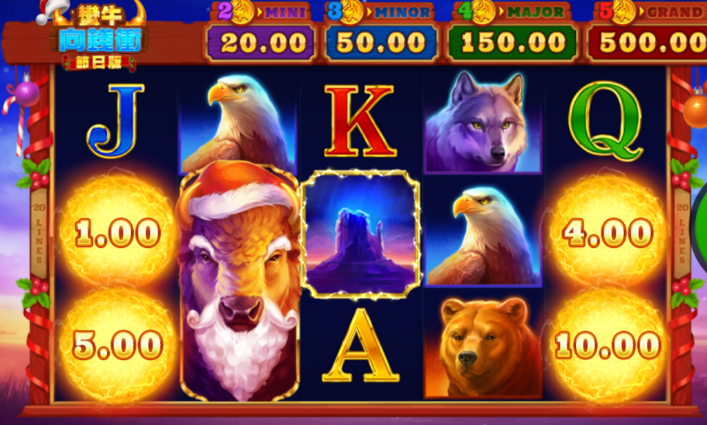 遊戲畫面完美融合了節日元素與美洲大草原風格,蠻牛戴上聖誕帽,畫面充滿冬季溫暖氛圍,但獎勵機制仍然火熱如初。Wild符號可替代其他符號,幫助玩家組成高額連線,而當六個或以上的火焰金球符號出現,將觸發獎勵遊戲,帶來連續重轉與高倍獎勵。