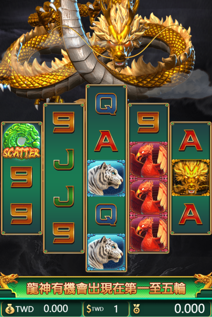 遊戲採用經典的五轉軸設計,並搭配多種高價值符號,包括金龍、鳳凰與白虎,每一次轉動都有機會迎來強大財富。而最令人興奮的機制,便是「龍神」的隨機出現,它有機會降臨在第一到第五輪,為玩家帶來額外的驚喜獎勵。此外,綠色龍形SCATTER符號則是進入免費遊戲模式的關鍵,當觸發時,將開啟更加豐厚的獎勵機會。