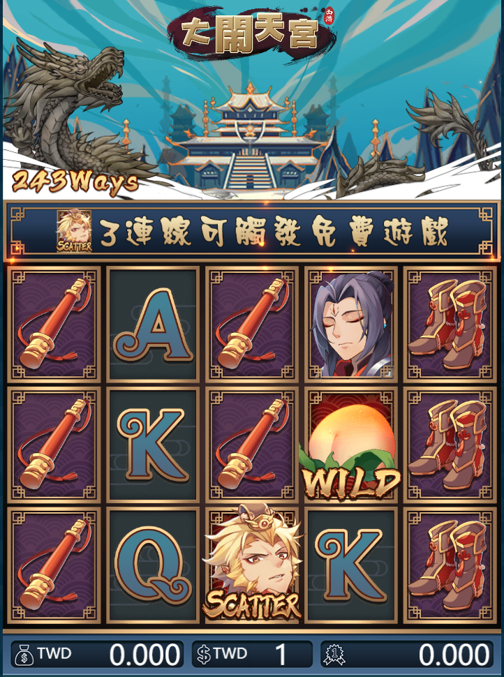 本遊戲採用243種獲勝方式,讓玩家在轉動轉輪時擁有更多的連線機會。而遊戲中最重要的符號之一就是WILD百搭,以仙桃作為象徵,能夠替代所有一般圖標,提高獲勝機率。而當盤面出現三個SCATTER符號,便能觸發免費遊戲模式,開啟更多額外旋轉與高額獎勵。