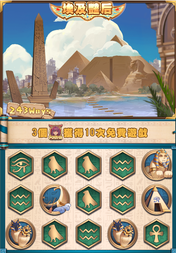 《埃及豔后》這款遊戲的氛圍極具異國風情,帶領玩家穿越時空回到古埃及的金字塔與神秘符號之間,整個畫面設計細膩,讓人彷彿置身於一場考古探險之中。