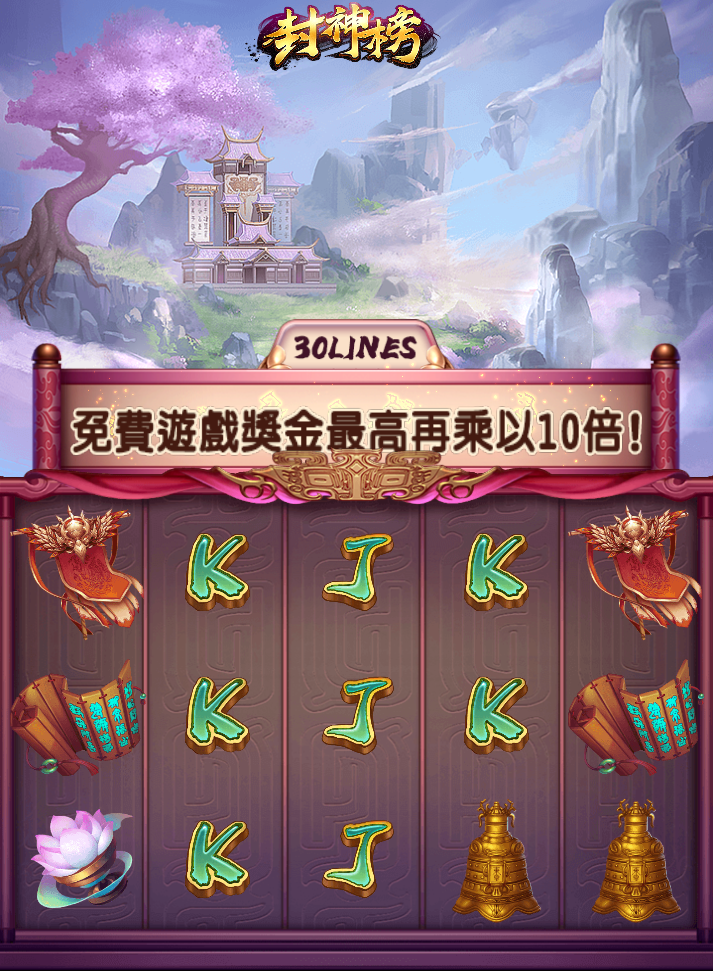 遊戲採用30條獲勝線,讓玩家在旋轉間輕鬆發現連線獎勵,並且擁有獨特的免費遊戲機制。當畫面中出現特定的Scatter符號,即可觸發免費遊戲模式,獎金更可在遊戲中累積至最高10倍!此外,遊戲內還設計了充滿神秘色彩的各類圖標,例如蓮花、鐘鼎、戰鼓與古籍卷軸,每個細節都展現出封神榜的傳奇故事氛圍。