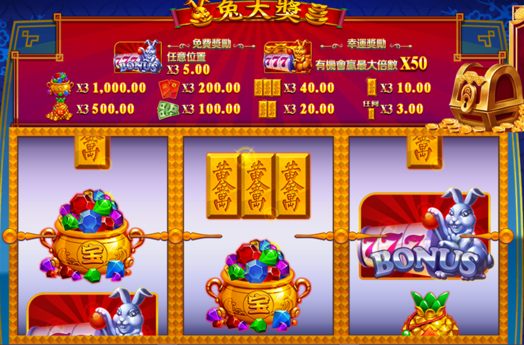 遊戲玩法簡單但充滿刺激,轉軸上的特殊符號如「BONUS」兔子標誌能觸發免費遊戲,而出現金磚符號則可帶來驚喜倍數獎勵,最高可翻倍至50倍,讓玩家輕鬆贏得大獎。此外,當三個黃金萬字符號出現在畫面時,更有機會開啟幸運獎勵,帶來額外的豐厚回報。