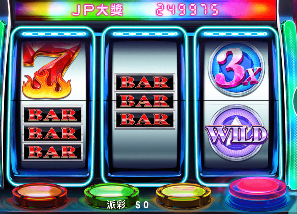 遊戲採用經典的三轉輪機台設計,畫面中可以看到熟悉的「7」、「BAR」、「WILD」與「JACKPOT」符號,每一種圖案的排列都可能帶來高額乘數回饋。像是只要轉出3個乘倍圖案(例如兩個5x加一個WILD),就能直接抱走1000倍的彩金!