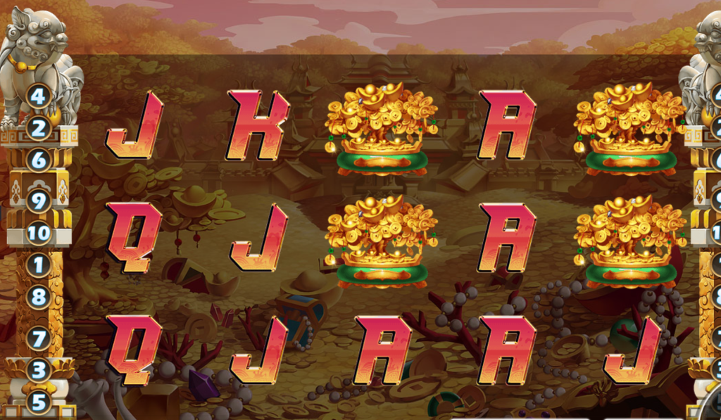 遊戲採用5×3盤面設計,搭配豐富的高亮度符號,例如A、K、Q、J字母融入金紅漸層,展現尊貴與吉兆的氣息。而最吸睛的當屬金色財神樹,不僅作為高賠圖案,更是整場遊戲的核心象徵,象徵著添財納福的好運連連。