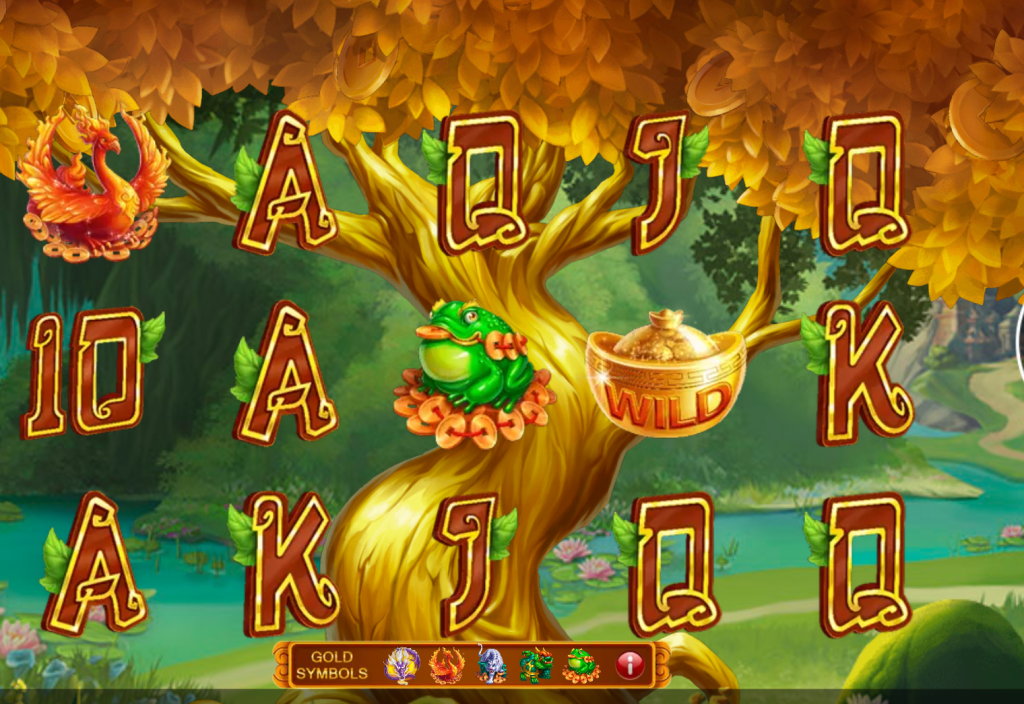 轉動輪軸時,金蟾、貔貅、鳳凰等瑞獸接連現身,每一隻都象徵著財運與守護,搭配華麗的「金元寶 WILD」圖示,形成強烈的中獎氛圍。不僅圖示設計精緻,連字母與數字都被綠葉點綴,呼應整體吉祥意象。