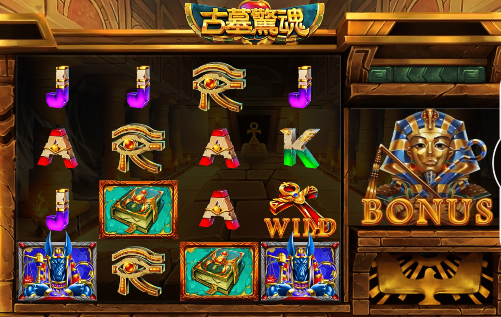 《古墓驚魂》是一款以埃及神祕文化為背景的冒險主題機台。畫面設計充滿金字塔、法老面具與神祇雕像元素,整體呈現出濃厚的古文明氛圍。搭配暗金色調與高光細節,讓人宛如親身闖入千年古墓尋寶。