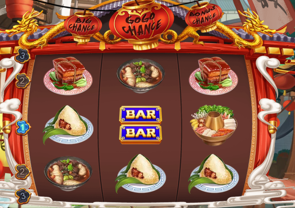 玩家進入遊戲的瞬間,就彷彿被邀請坐上紅色大桌,燈籠高掛、金龍環繞,整體畫面以傳統中式餐館風格呈現,讓人沉浸在一場“轉盤上的美食饗宴”。畫面上方更寫有「BIG CHANCE」、「GOGO CHANCE」、「BONUS CHANCE」三種機會提示,營造出濃厚的中獎期待感。