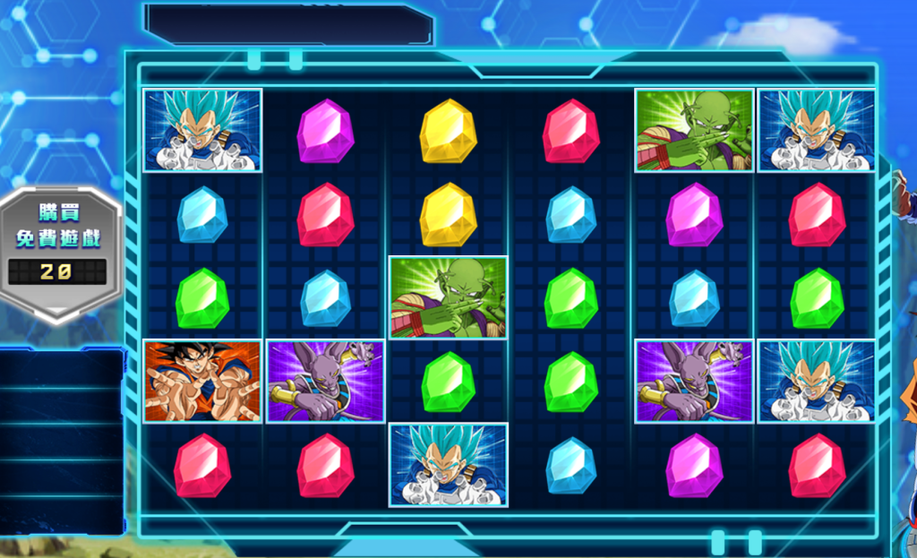 這款七龍珠主題機台一開始就讓我眼睛一亮,畫面設計就像動畫戰鬥場景,悟空、貝吉塔、比魯斯、比克等角色不只是符號,更像是在盤面中實際開戰。當我轉到8個以上相同圖案時,就能獲得對應分數,而這種大量連線機制讓人一轉就停不下來,尤其當畫面開始連擊消除,節奏就像角色們的連招一樣連貫流暢。