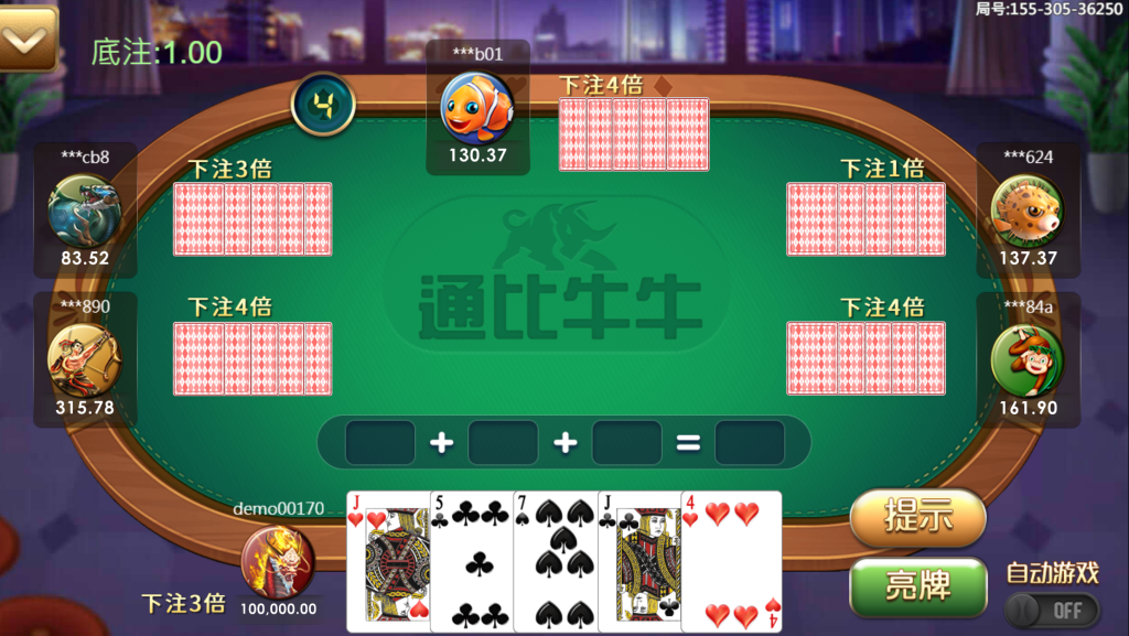 開局後所有玩家先選擇下注倍率,從1倍到4倍都有,倍數越高風險與報酬也越大。下注完成後,系統會自動發出五張牌,每位玩家拿到牌後,可以透過提示功能協助選牌組牛,最後再點擊「亮牌」按鈕正式比拼。我認為這種操作方式不僅直覺,也讓新手更容易進入狀況,幾局下來就能掌握節奏。