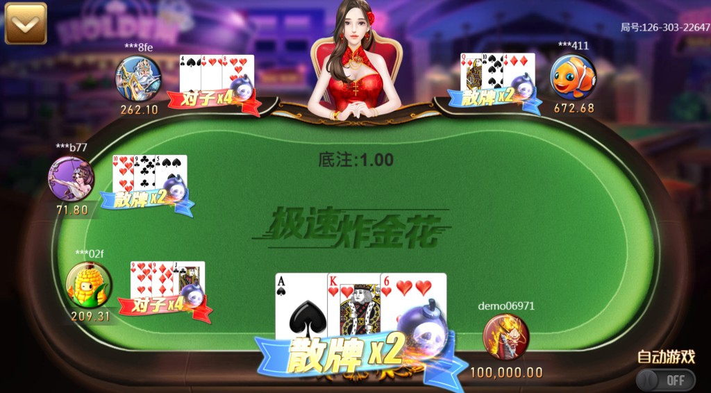 每位玩家開局獲得三張手牌,系統自動比牌並立即公佈結果,不用等待、不用下注拉鋸,直接決勝負。牌型分為「散牌」、「對子」、「順子」、「金花」、「同花順」、「豹子」等級,系統會自動加乘倍數,例如對子x4、散牌x2等,讓玩家輕鬆理解每手牌的價值。