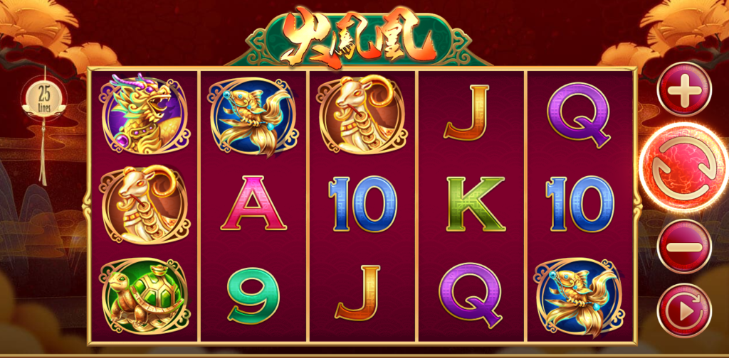 遊戲採用五輪三排設計,具備25條固定賠線,讓玩家不需太複雜的操作就能順暢體驗連線樂趣。而火鳳凰作為核心百搭符號,出現在轉輪中時會展開成整列,並帶來爆發性的中獎機會。我認為這種視覺搭配音效的同步演出,讓每一次轉出火鳳凰都像是一場金光炸裂的驚喜時刻。