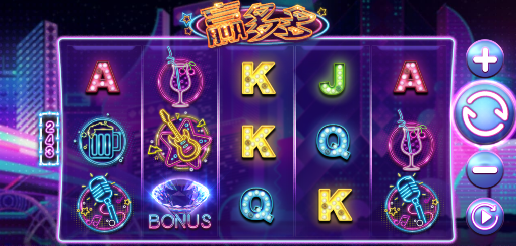 遊戲採用243種得分方式,只要相同圖案由左至右連線三個以上,就能獲得獎勵,玩法簡單卻充滿節奏感。每一個符號都經過精緻設計,像是搖滾吉他、啤酒杯、麥克風等,都帶有舞台感與派對魂,尤其那顆鑽石「BONUS」圖案,更讓我第一眼就愛上。
