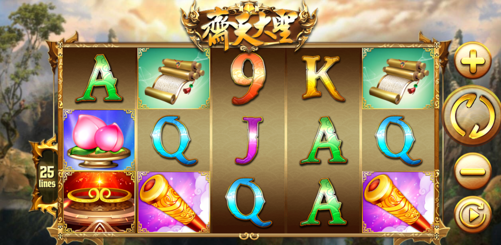 遊戲介面右側設有旋轉鍵、加減投注控制與自動旋轉功能,整體操作直覺流暢,配合左側顯示的25條線路設計,提升了獲勝的機率與趣味性。《齊天大聖》不僅是視覺上的饗宴,更是一次神話探險的華麗冒險之旅。