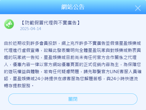 公告最後提到:「若有任何疑慮問題,請聯繫官方LINE客服,星盈娛樂城24小時提供客戶服務。」但說真的,我用過他們的客服系統,感覺就是非常制式化,問什麼都只會得到像是罐頭式的回應。