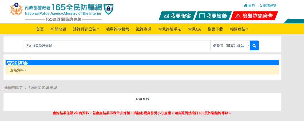 SWIN星盈娛樂城詐騙是否存在?165全民防詐網查無紀錄≠安全平台!