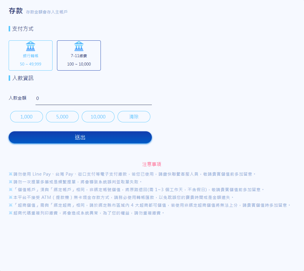 銀行轉帳的設定是金額需落在50~49,999元之間。這點我覺得還OK,畢竟能涵蓋從小額測試到中額投注的需求。不過問題來了,如果玩家只是想試玩個幾把,存個20元或30元,對不起,系統不給你這個選項。對某些謹慎的新手來說,這會讓人覺得門檻偏高,沒有彈性。