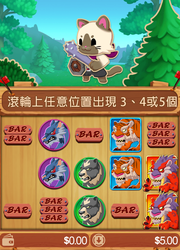 《BE電子-怪獸獵人》是一款以森林奇幻冒險為主題的拉霸遊戲,整體畫風走的是可愛童趣風格,但玩法上卻蘊含著豐富的爆發力與節奏感。畫面中主角是一隻身穿斗篷、手持戰錘的小貓戰士,他站在森林前方,隨時準備迎戰盤面中出現的各種怪獸。