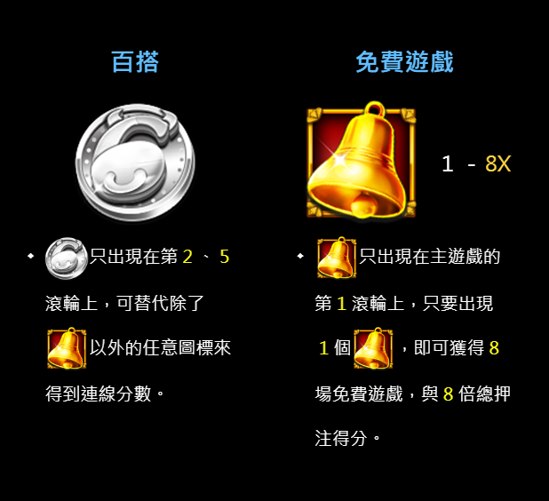 我特別喜歡它的免費遊戲觸發方式,跟傳統拉霸相比可說是相當簡潔又直給。只要在主遊戲的第一滾輪出現一個金色鈴鐺,就能直接獲得8場免費遊戲,並且還加上8倍總押注獎勵。這種設計讓我每次看到鈴鐺圖示都會緊盯著畫面,因為那不只是免費轉而已,還可能是爆倍的起點。